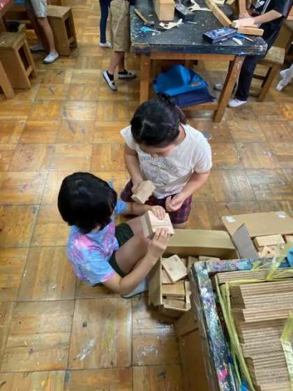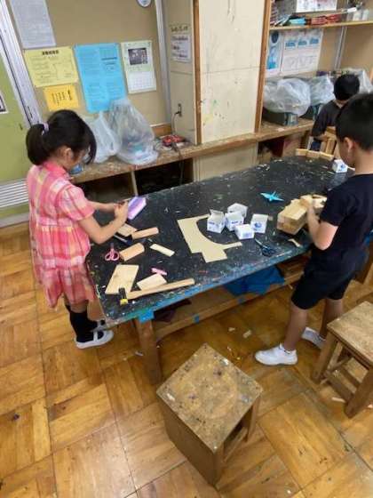 材料の木材の中から、自分が作りたいものに合う大きさのものを選んでいます。