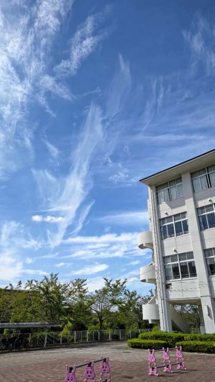 このところしばらく、半日の出張が続いていましたので、なかなか自身で学校日記がアップできず、副校長先生に頼り切っておりました。今日もお昼に学校に戻ってきました。空を見ると明らかにこれまでと違う秋の雲が広がっています。運動会の練習真っ盛り、校庭からは子供たちの元気な声が聞こえてきます。