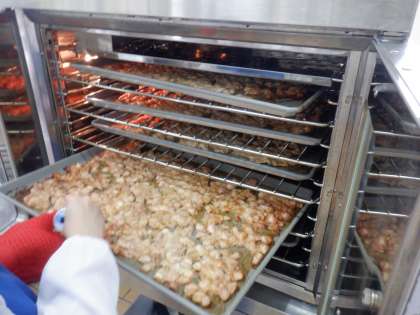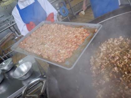 *やきとり丼は、オーブンで焼き目をつけてから、釜でたれとあわせています。釜には、炒めたごぼう、長ねぎがすでに入っています。(写真2,3枚目)