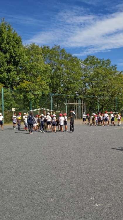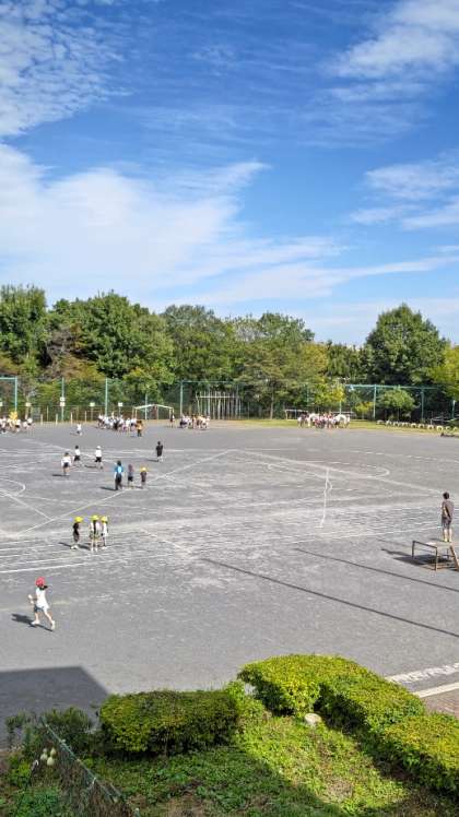 爽やかな秋空の下、ゴールデンタイム(掃除なしの昼休み)に子供たちが校庭に出てきました。たてわり班ごとに集まっています。