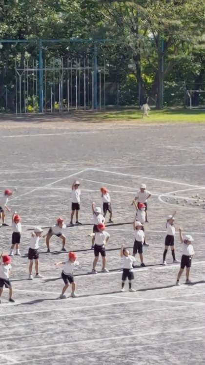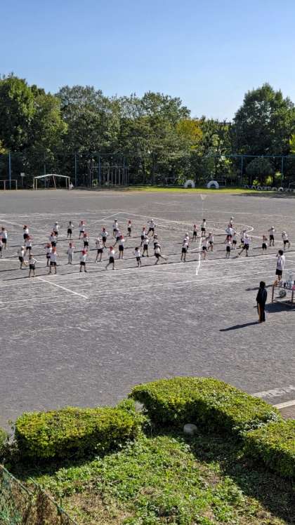 [1年生2年生体育]演技「☆ドキメキキラリ☆」そして競技「PON!PON!玉入れ」の練習をしています。2階から撮りました。