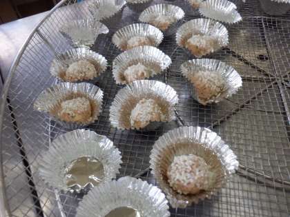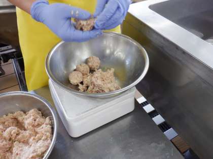 *いがむしは、しゅうまいの皮のかわりにもち米をつけてあります。くりのいがいがを表現しています。大きさをはかりながら均等に丸めていきます。(写真2枚目)