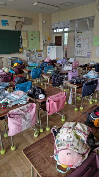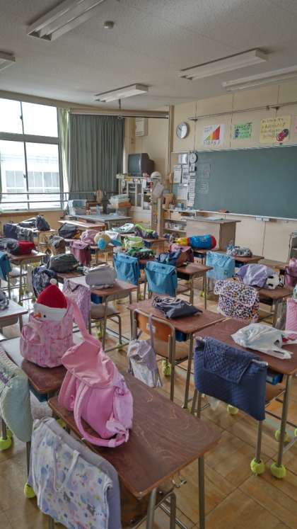 2年生の教室です。昨日欠席者多数のため、3日間の学級閉鎖になってしまいました。運動会当日は平常登校できます。机の上に担任の先生が運動会で使うグッズを丁寧に並べていました。2年生のみなさん、元気に体調回復することを願っていますよ。