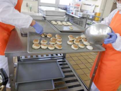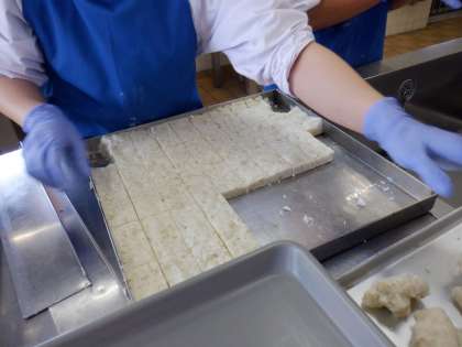 *じゃがもちは、じゃがいもを蒸してからつぶし、牛乳や、ごま、さとう、塩、片栗粉をまぜ、大きさをそろえてカットし、丸めていきます。写真2枚目