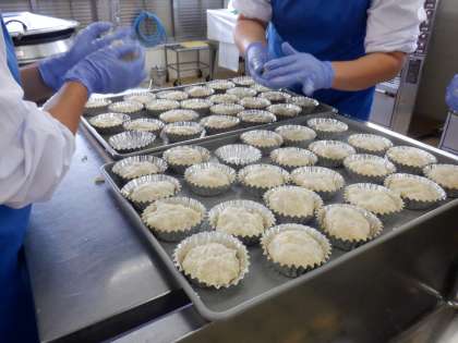 「コロッケ好き!」「大きなコロッケをみんなで分けて食べるのかな?教えて教えて」など、どんなコロッケが給食ででるのか、楽しみな様子でした。大きなフライパンをイメージして一つずつカップに入れて作りました。写真3枚目