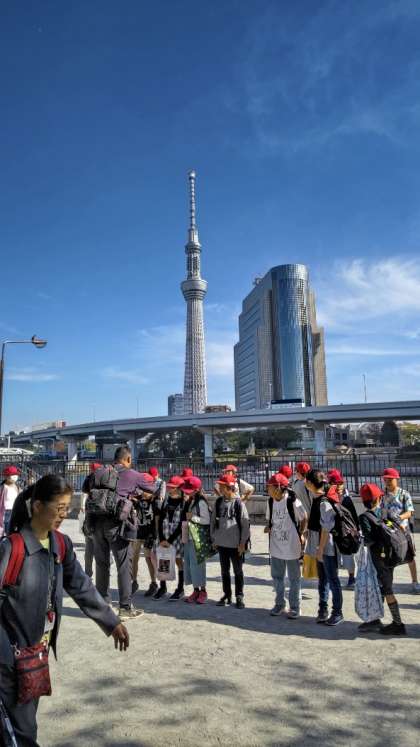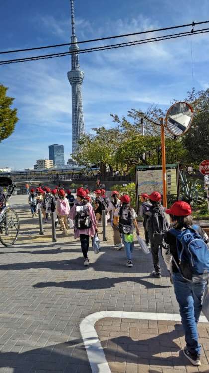 (歩いて隅田川へと向かいます。スカイツリーが目の前に見えます)
