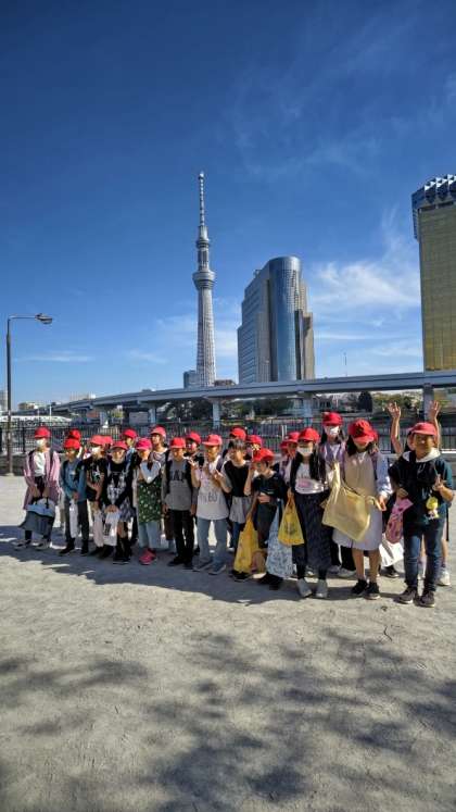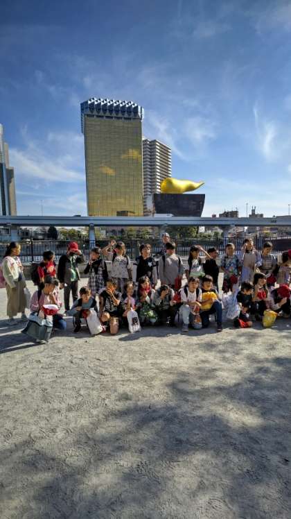 (スカイツリーとビール会社のオブジェをバックに写真です)