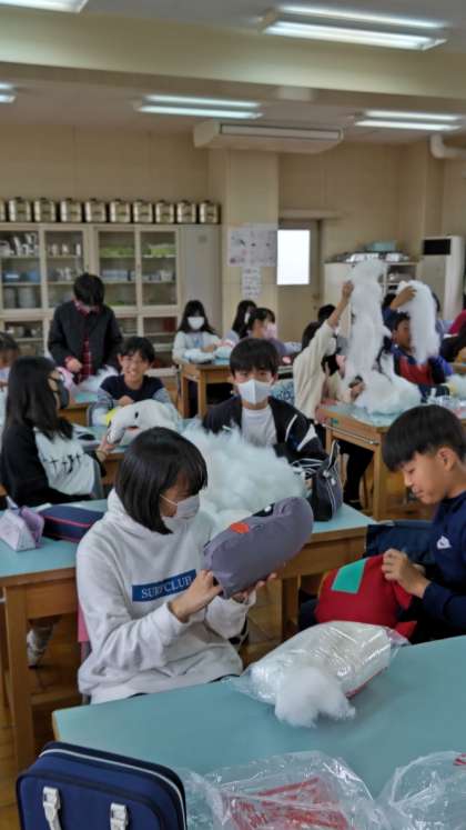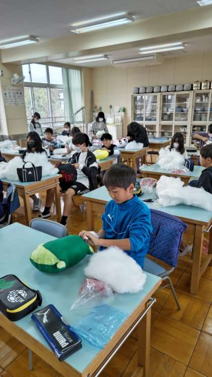 [6年生家庭]「クッションづくり」の最終週です。今日は中に綿を入れて完成させていきます。