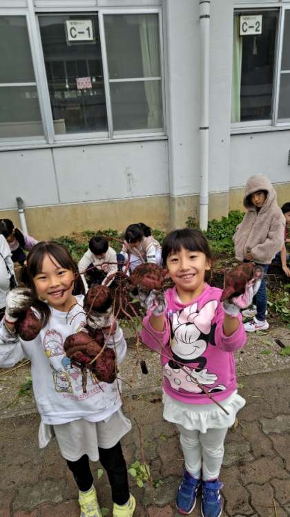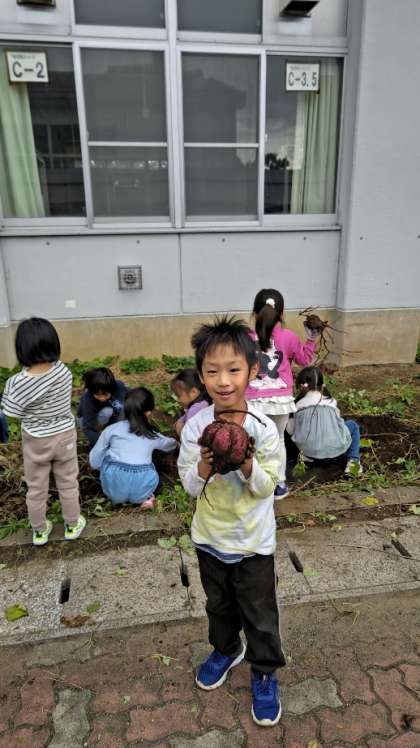 [1年生生活]中庭で1年生がサツマイモの収獲をしています。思わず「まんまるで、でっかいね〜!」と言ってしまいました。