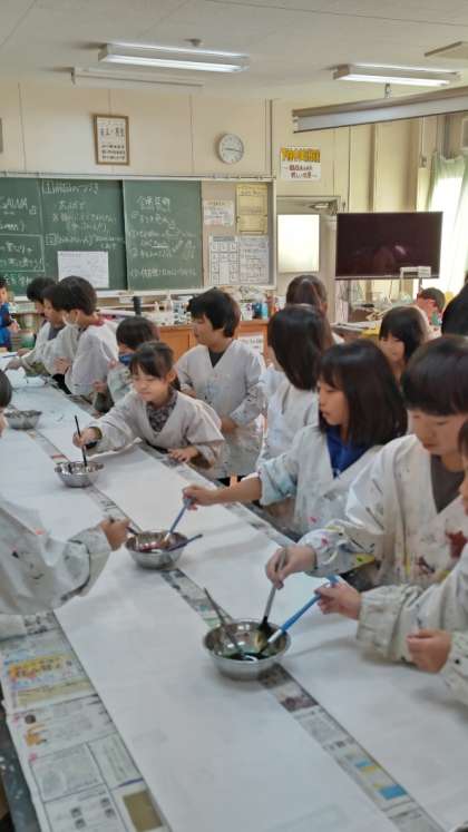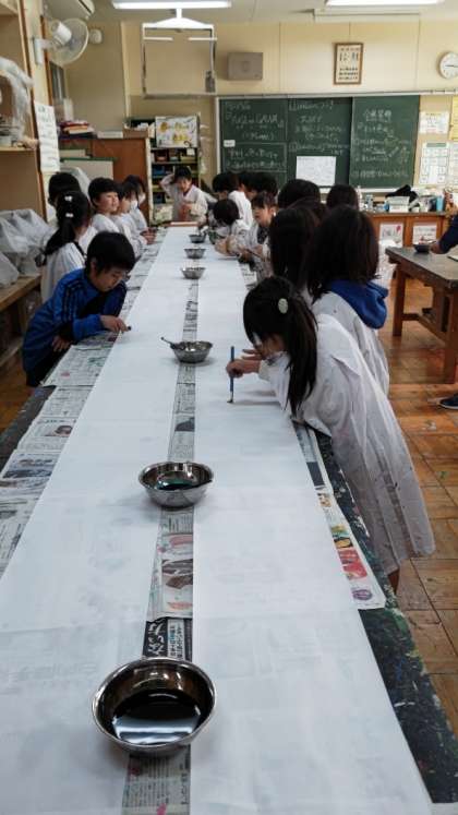 [2年生図工]2年生が1枚の長い紙の前に、筆を持って並んでいます。共同作品づくりです。
