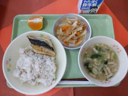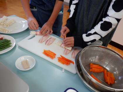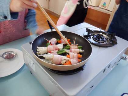 *6年生は1,2校時に家庭科の調理実習を行いました。普段は、給食室から教室や廊下にいい匂いが漂いますが、今日は、家庭科室から給食室にベーコンを炒めているとてもいい匂いがしてきました。野菜のベーコンまきを作っていました。自分たちが作った料理は、とてもおいしいと思います。おうちでもぜひ作ってくださいね!(写真2,3枚目)