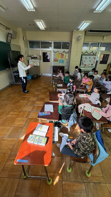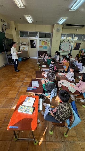 「こいぬのマーチ」に合わせて、トライアングルや鈴を演奏する練習をしています。