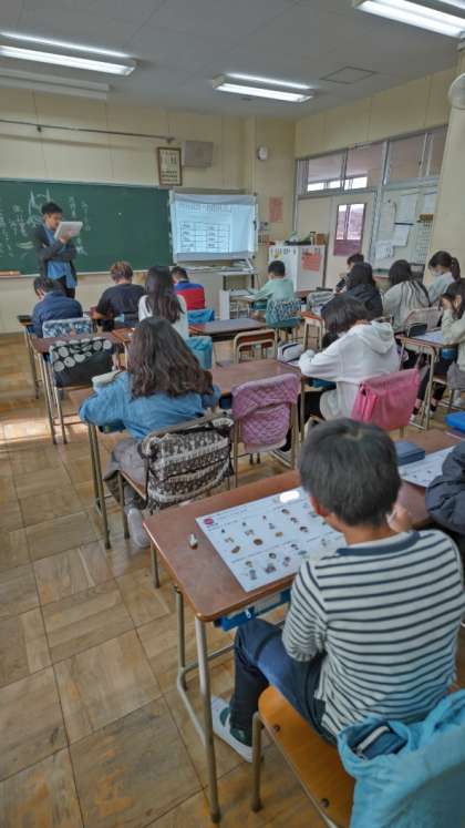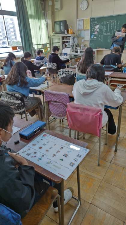 [6年生外国語]「It was green.」リスニングのテストをしています。先生の話す英語をよく聴いて問題に答えます。