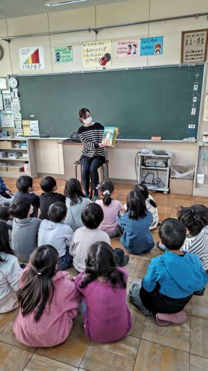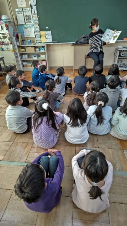 今朝は読み聞かせから始まります。1年生から6年生まで全学年です。子供たちが楽しみにしている時間です。写真は2年生です。