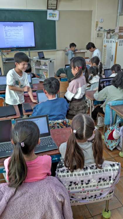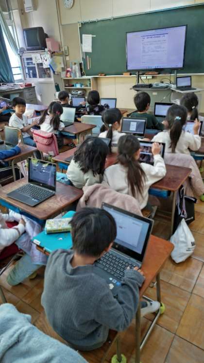 1年生がPCを使っています。先生が説明しながらアンケートに答えているのです。一人一台学習端末が始まってしばらく経ちます。