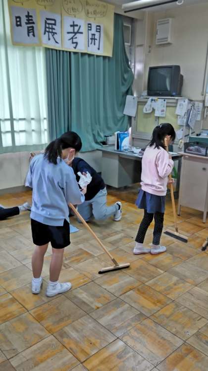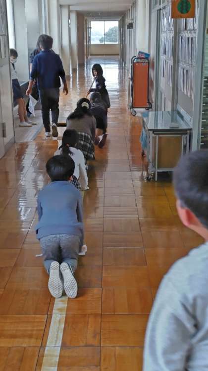 (仲良く列になって雑巾がけ)