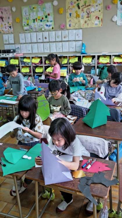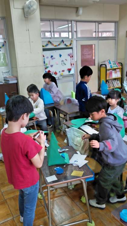 (紙を折って立てたツリーです)