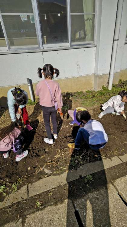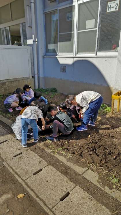 [1年生生活]今日はよく晴れています。冬の柔らかい日差しの中、1年生が中庭に出てきました。シャベルを持って学級園に集まりました。