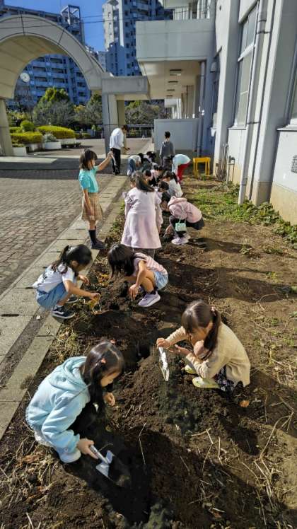 (学級園にこのあと花の球根を植えるために、土を柔らかくしています)