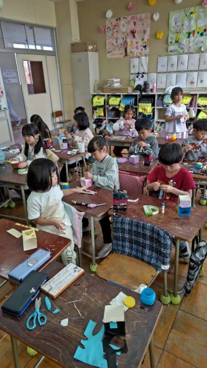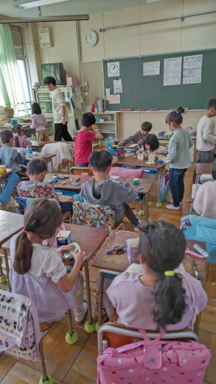 [1年生図工]「ぎゅうにゅうパックで こものいれ」を作っています。今日一日で仕上げます。