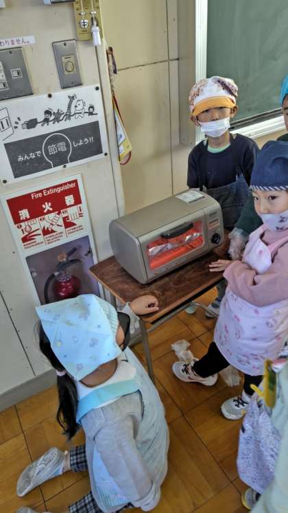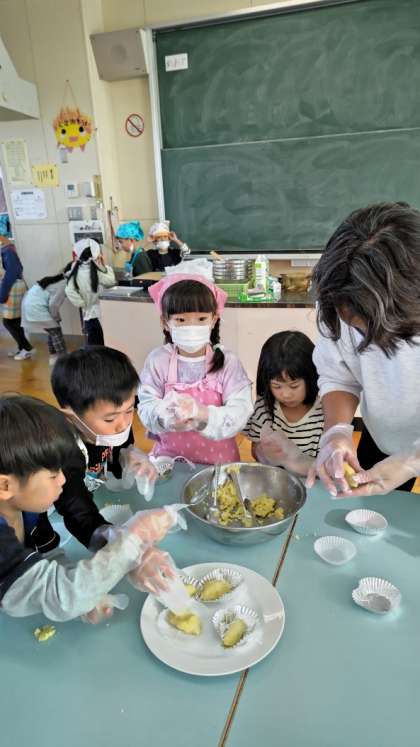 (1年生が家庭科室で「サツマイモパーティー」をしています)