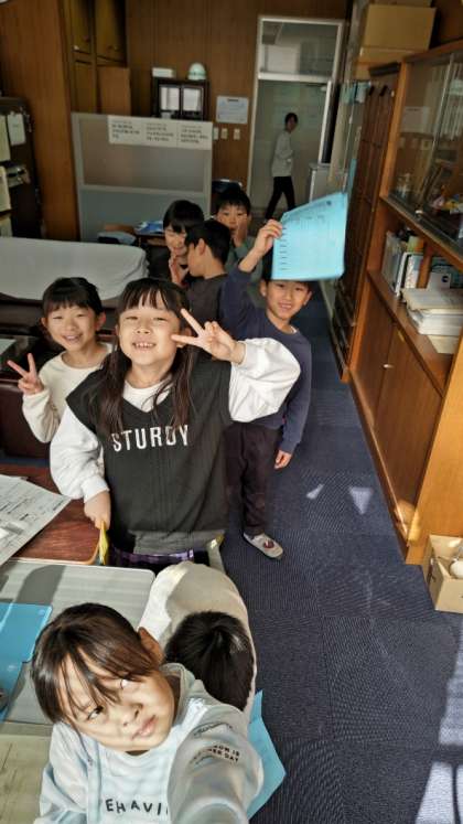 いよいよ2学期も残りあと3日間となりました。全国的にインフルエンザ等の感染症が流行し、学級閉鎖実施数の拡大が報じられている中、本校は今のところ大丈夫です。保護者の皆様によるお子様の健康管理に深く感謝しています。子供たちは毎日元気に活動しています。このまま無事に冬休みを迎えたいと願っています。写真は今日も校長室を明るく楽しくしてくれる2年生たちです。