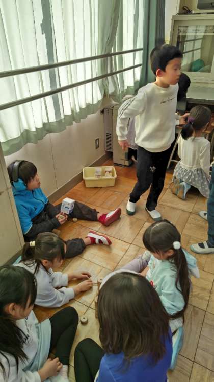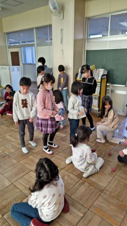 [1年生2年生生活]低学年が2つある学習室に集まりました。みんなで昔遊びをするようです。お正月ですからね。