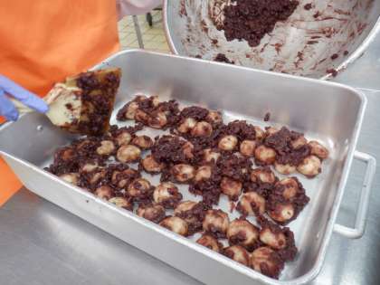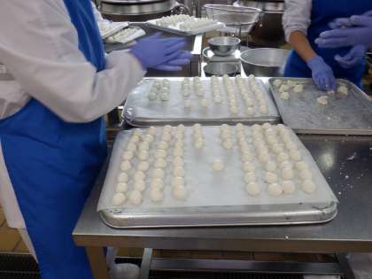*今日は、白玉を大きさをそろえて440個丸め、給食室で作ったあんこにあえました。写真2,3枚目