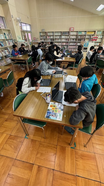 図書室の本と学習用端末を使って、いろんな仕事について黙々と調べています。