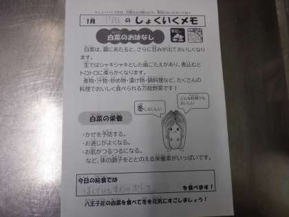 *白菜は、今が旬です。今後もたくさん給食で登場していきます。今年は、今のところできもよく安価ですので、是非ご家庭でも食べてください。