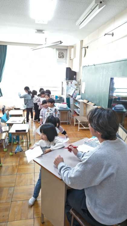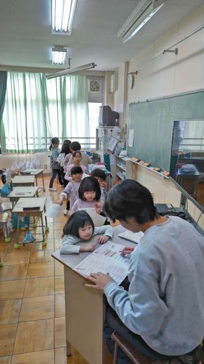 [1年生算数]1年生も算数の問題に取り組んでいます。問題が解けたら、並んで先生に丸付けしてもらいます。