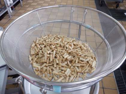 *岡山県には、「明治ごんぼう」と、「連島(つらじま)ごぼうというブランドがあります。ごぼうを油で揚げたところ。これからたれに絡ませます。・・・写真2枚目