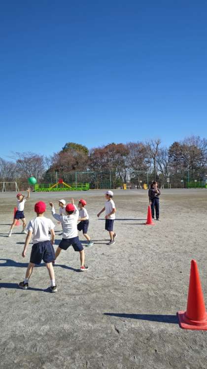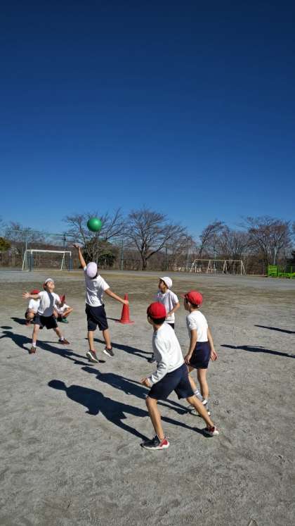 [3年生体育]よく晴れた一日です。校庭で楽しそうに3年生がボールゲームをしています。