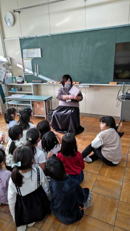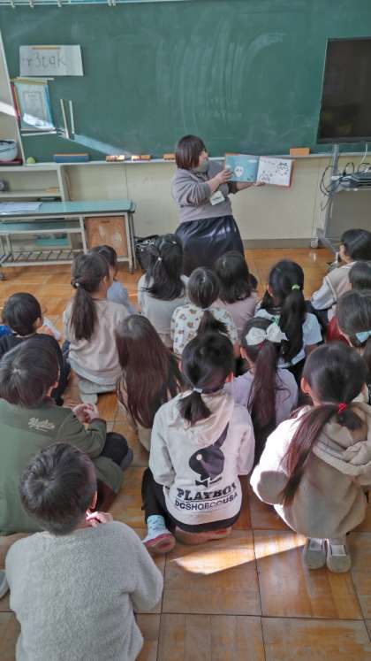 今朝は1〜3年生の読み聞かせです。まずは1年生の教室です。静かに集中して聞いています。今日は何の本かな?