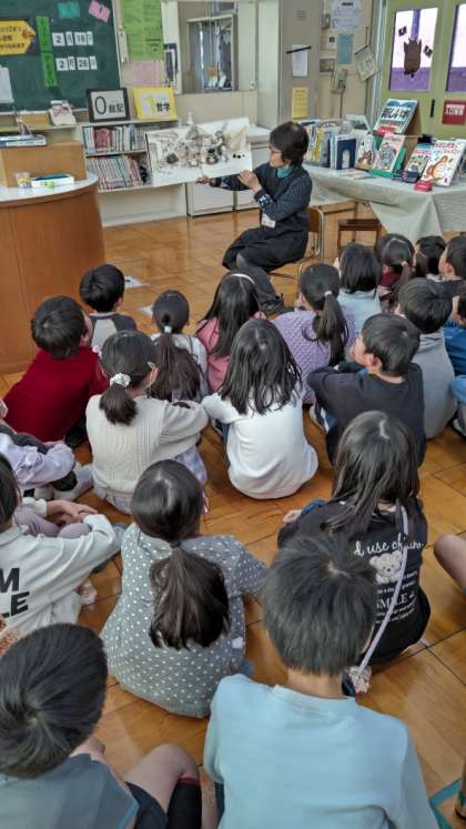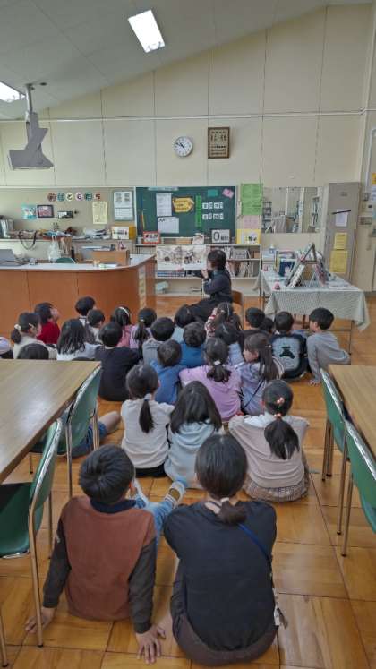 [2年生国語図書]毎週金曜日は学校司書の先生がいます。2年生が図書室の前に集まって読み聞かせを聞いています。