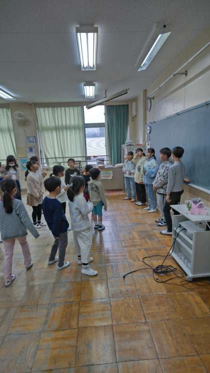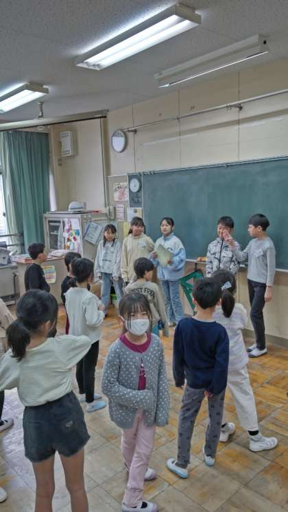 今朝の集会は「たてわり班遊び」です。朝は雨が降っていたので、教室の中で工夫して遊びます。高学年が上手にリードします。写真は3班です。