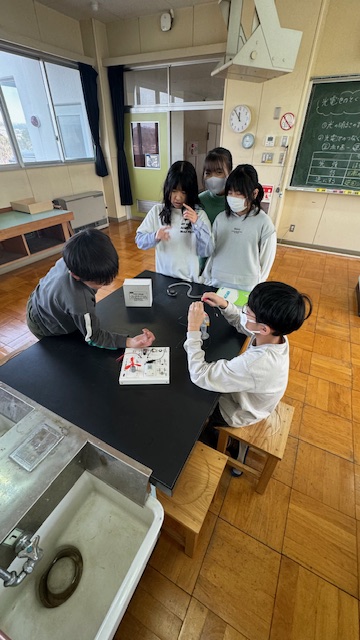 同じ回数だけ手回し発電機でコンデンサーに貯めた電気を豆電球と発光ダイオードにそれぞれつないで、光り続ける時間を比較しています。