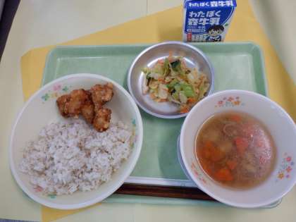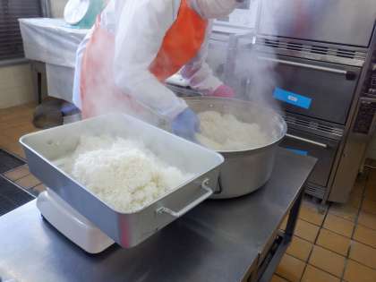 *麦はよくみると、米に比べて平たく、真ん中に線が入っています。今日は、11時40分頃ごはんを配缶しています。