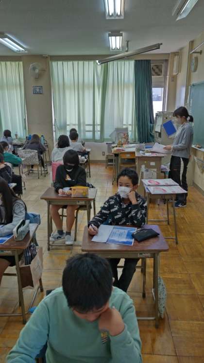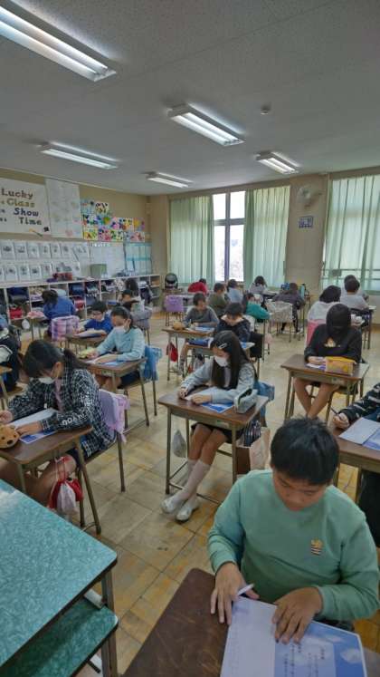 [4年生国語]「話す・聞く」のテストをしています。じゃましないように、廊下から写真を撮ります。