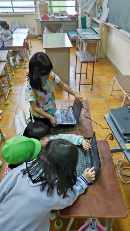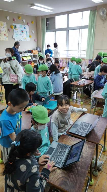 最後に1年生の教室へ戻ってきました。PCで学習中です。「一緒にやってみようか。楽しいよ」