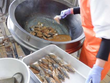*たっぷりのごまをいれてさばを煮ました。配缶してからたれを煮詰めてかけます。写真2枚目