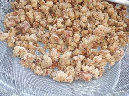 *とんてきは、分厚く切った豚肉をにんにくと濃い味のソースで焼き、たっぷりのキャベツと一緒に食べます。今日は、豚の角切り肉を揚げて作りました。豚肉を揚げたところ。これからたれに絡ませます。・・・写真2枚目
