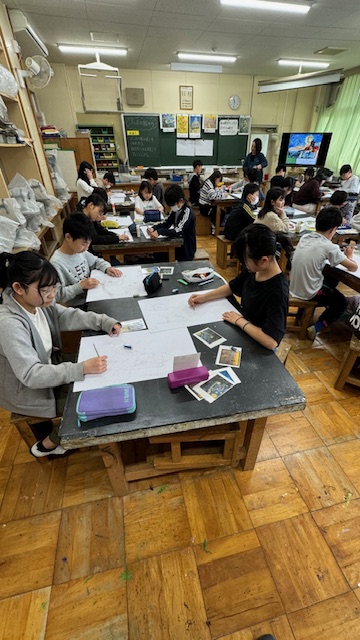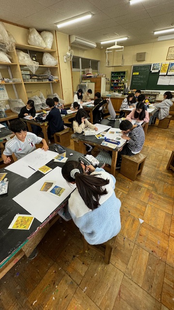 1時間目にゴッホの絵を鑑賞し、気がついたこと、思ったことなど、ワークシートにまとめた後、ゴッホの絵を模写していました。