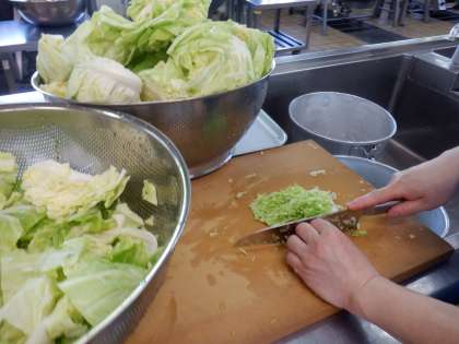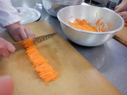 八王子産のキャベツ、静岡県産のにんじんを切っているところ・・写真2、3枚目