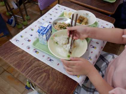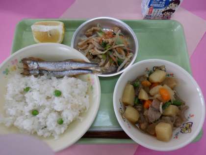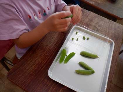 *2年生が1校時に今が旬のグリンピースのさやむき体験をしました。触ってみて、においや、音を感じながら全校分のさやをみんなでむきました。最初は、「グリンピースが苦手」という児童も多かったのですが、食べるのが楽しみといいながらむいていました。食育を通して、また好き嫌いが減っていけば、良いなと思います。