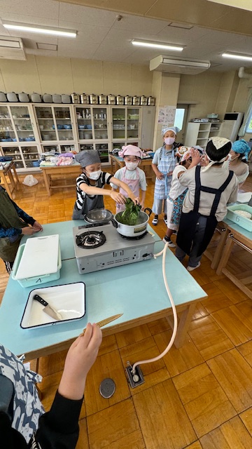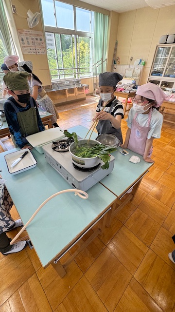 こちらも、ほうれん草をお湯の中へ投入中です。