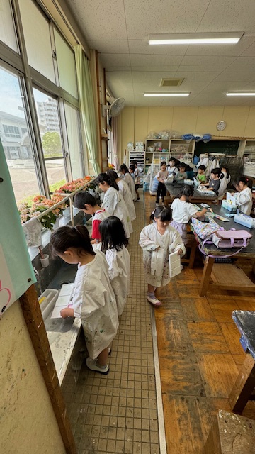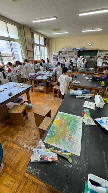 片付け中の子供たちの顔には絵の具がたくさん飛んでいました。