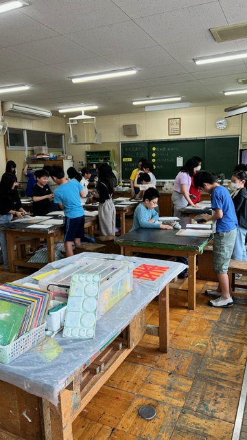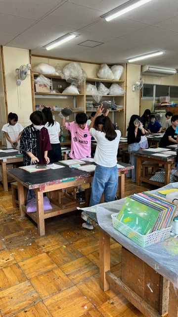 粘土を板に打ちつけて、粘土の中の空気を抜いています。焼いたときに、ひびや割れを防ぐためです。
