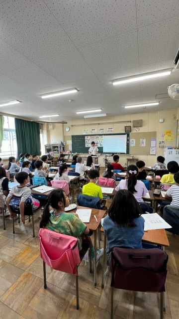 保護者の皆様が見守る中、子どもたちが英語で好きな遊びについて、たずねたり、答えたりします。