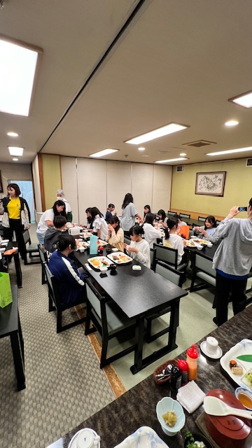 ご飯をよそったり、お茶を注いだり、みんなで協力しています。